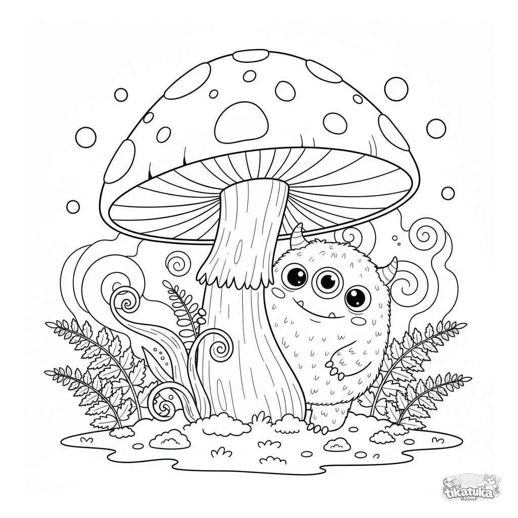 Página para colorear para niños de 5-8 años: un monstruo esponjoso de tres ojos juega al escondite detrás de un hongo grande.