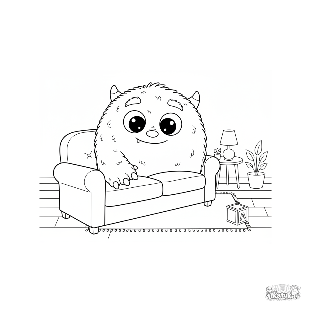 Página para colorear para niños de 4 a 6 años: un monstruo peludo de tres ojos asoma tímidamente detrás del sofá. Expresión divertida y amigable, un bloque volcado.