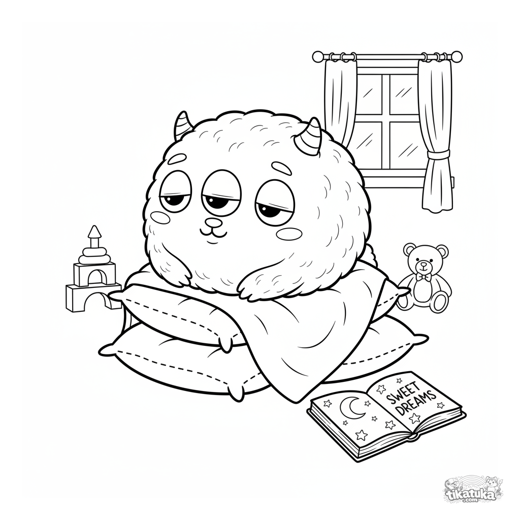 Página para colorear para niños: un monstruo peludo y amistoso de tres ojos durmiendo en un fuerte de almohadas. Estilo de dibujo animado lindo.