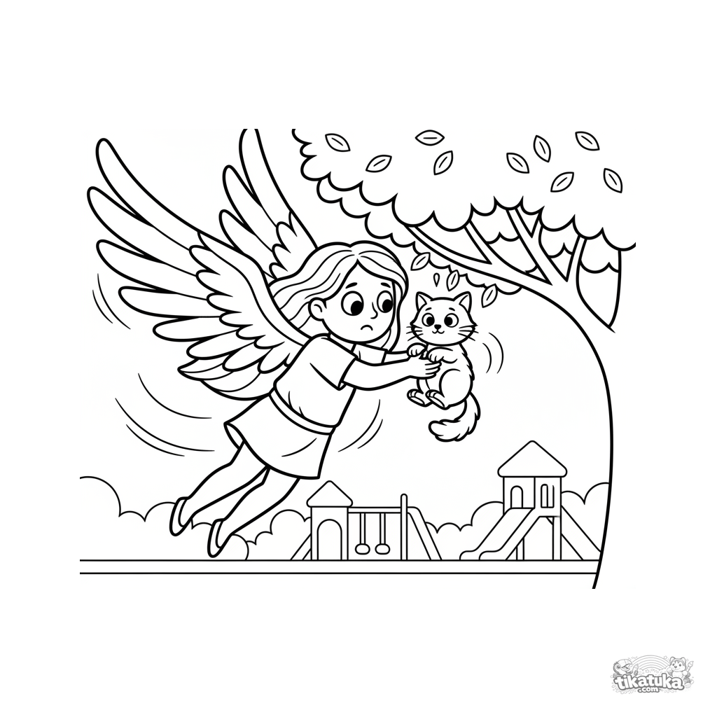 Página para colorear simple para niños pequeños 2-3: un amable superhéroe volador con alas de plumas rescata un gatito de un árbol en un patio escolar.