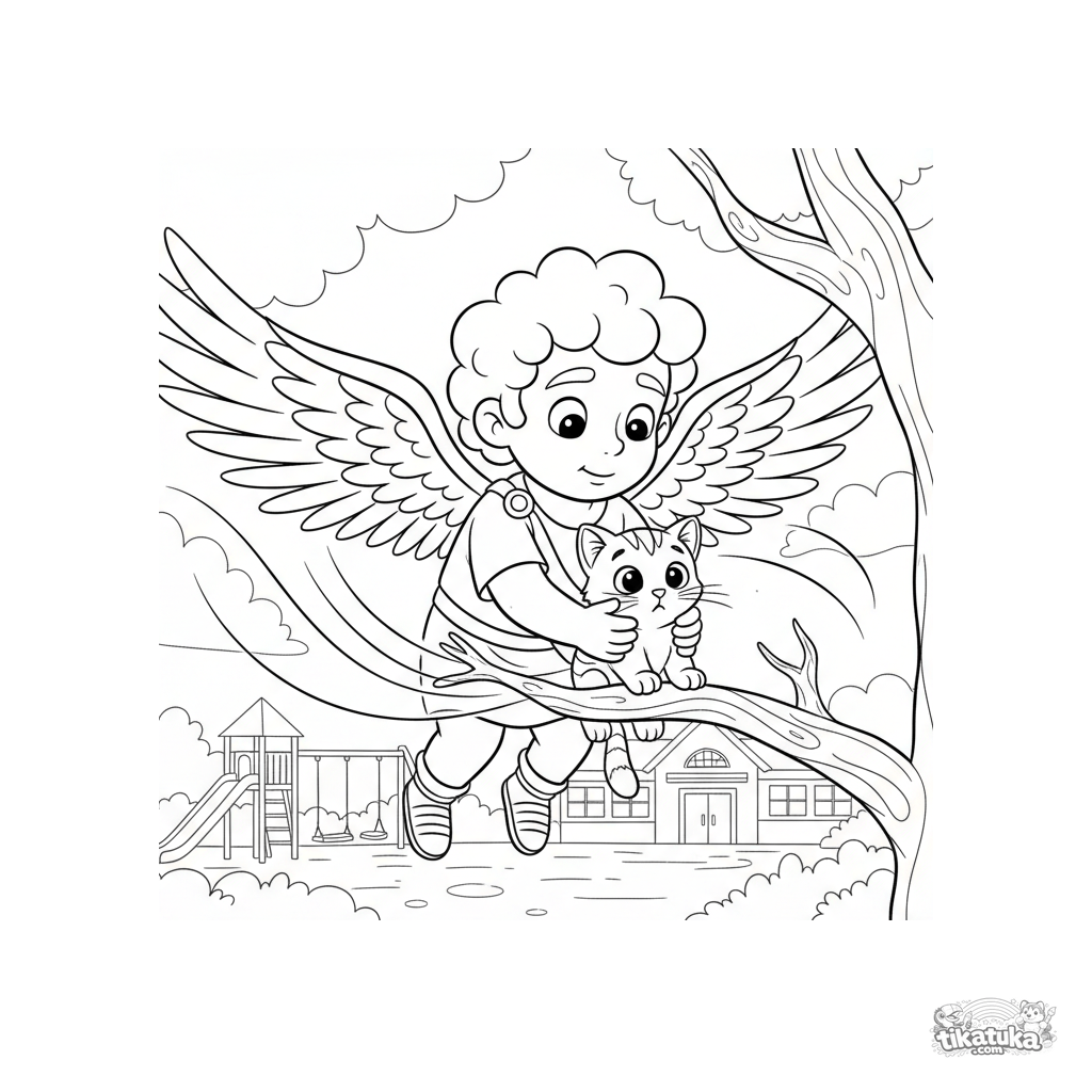 Página para colorear de un superhéroe volador rescatando un gatito de un árbol en un parque infantil. Para 7-9 años. Historia de rescate amable con animal.