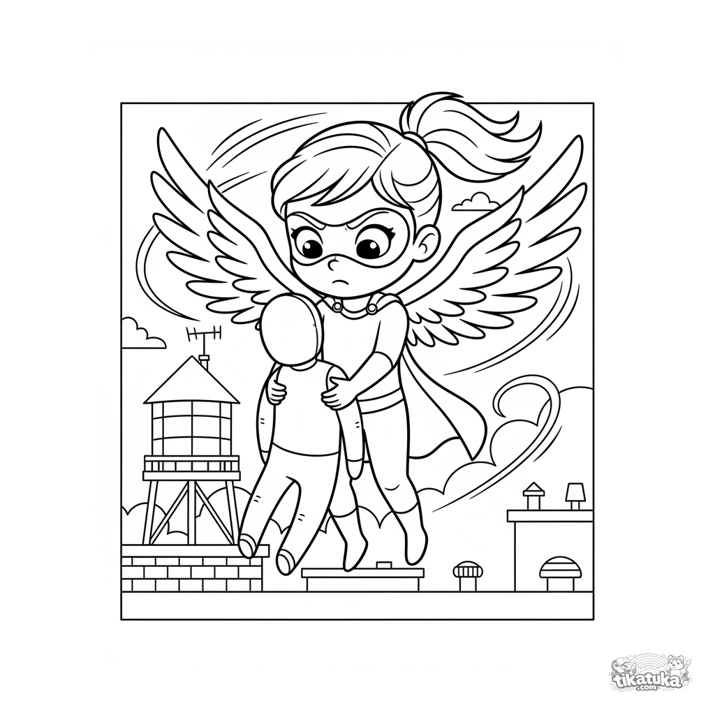 Página para colorear para niños 7-9: un superhéroe volador entrena levantando un maniquí en una azotea. Escena dinámica con alas.