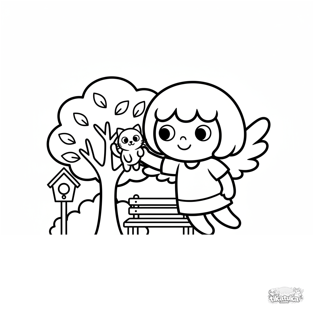 Página simple para colorear para niños pequeños 2-3: un héroe volador amable con alas rescata un gatito de un árbol. Formas grandes y contornos fáciles.