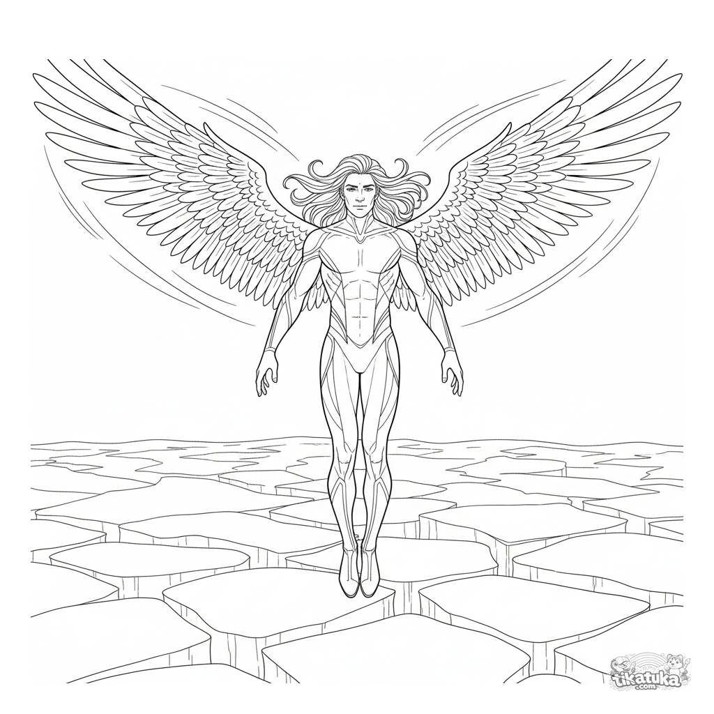 Página para colorear para mayores de 10-12 años: un superhéroe volador con alas de plumas sobrevuela un glaciar ártico.