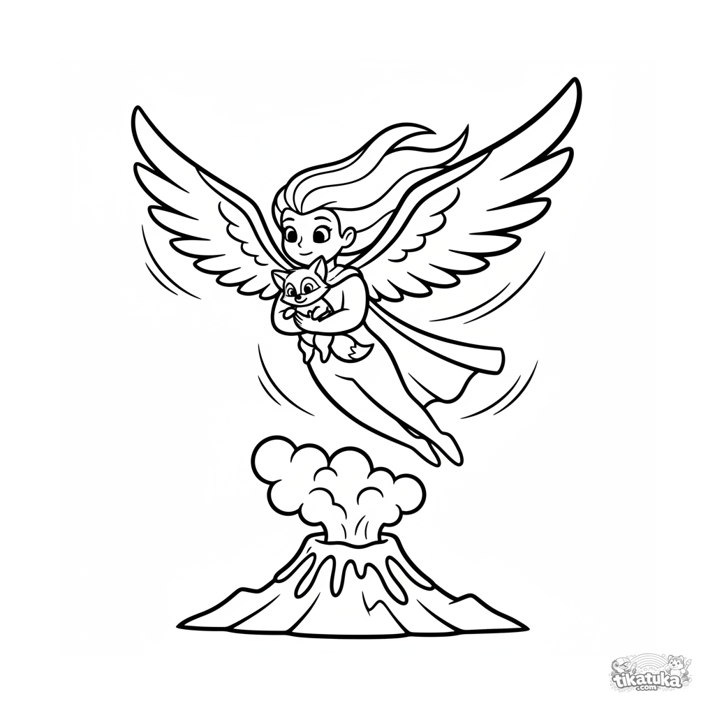 Página simple para colorear para niños pequeños 2-3: un superhéroe volador con alas grandes vuela sobre una isla volcánica, llevando un animalito rescatado.