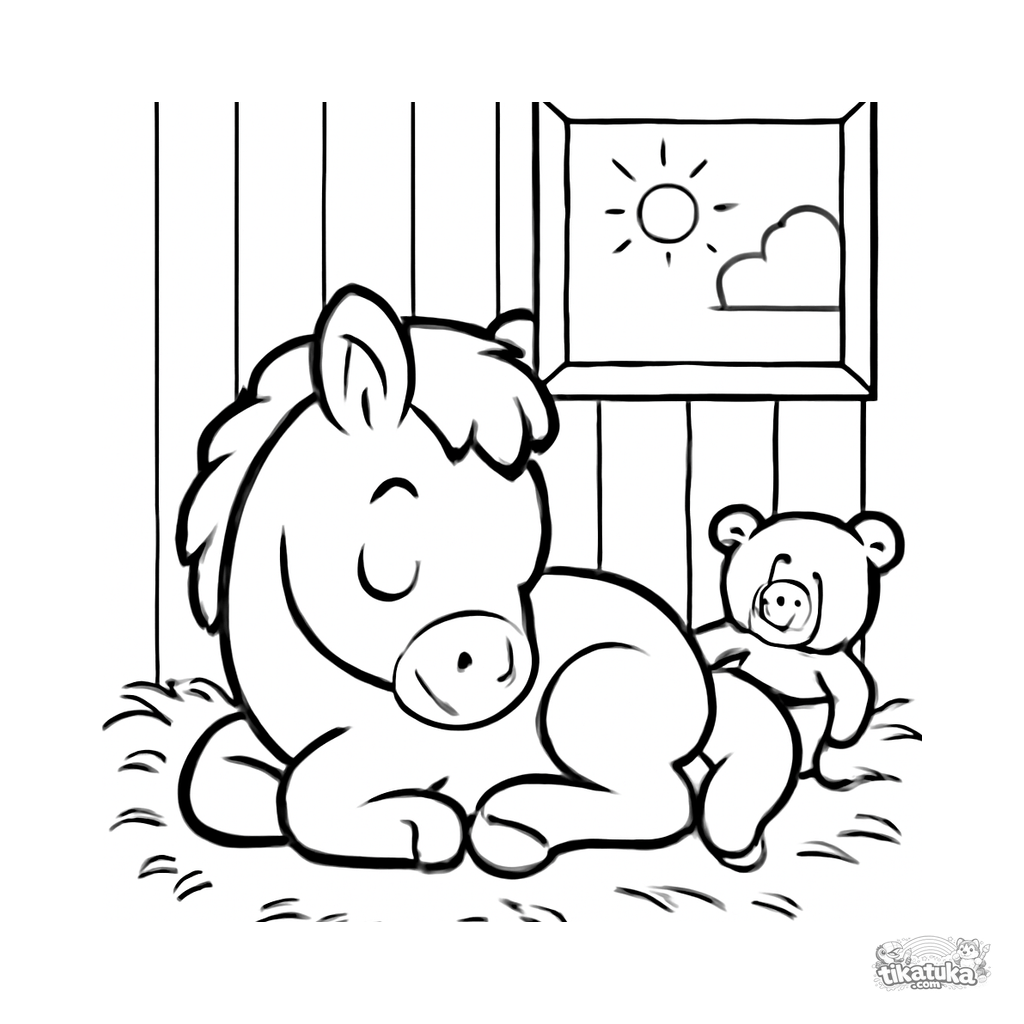 Página para colorear para niños. Un potro castaño durmiendo acurrucado sobre paja dorada en un establo acogedor con osito. Descarga gratis.