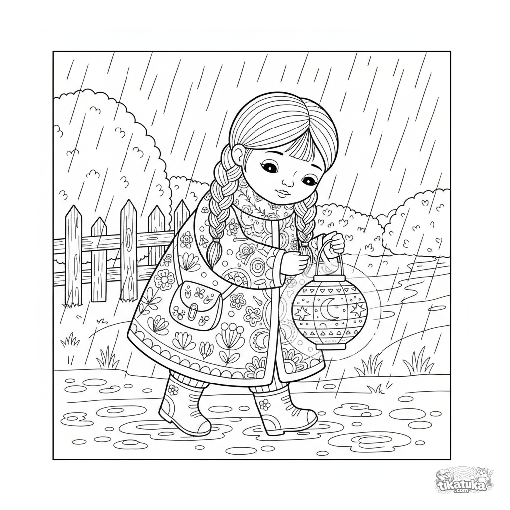 Página para colorear detallada de arte popular para niños 10-12: un niño con abrigo estampado camina con linterna por un camino fangoso al anochecer con lluvia otoñal.