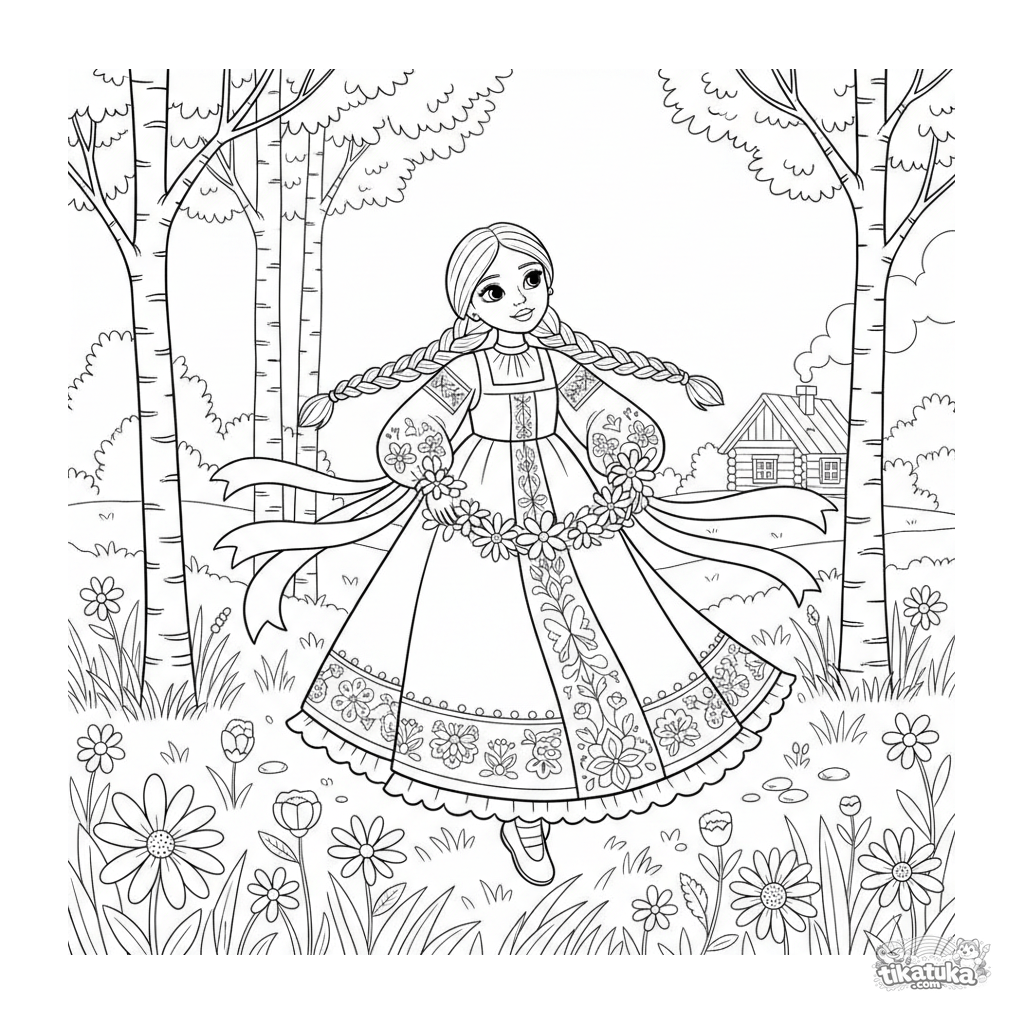 Página para colorear para niñas 10-12: una chica en un sarafán ruso detallado con bordado folclórico baila en un prado florido, con cintas en sus trenzas.