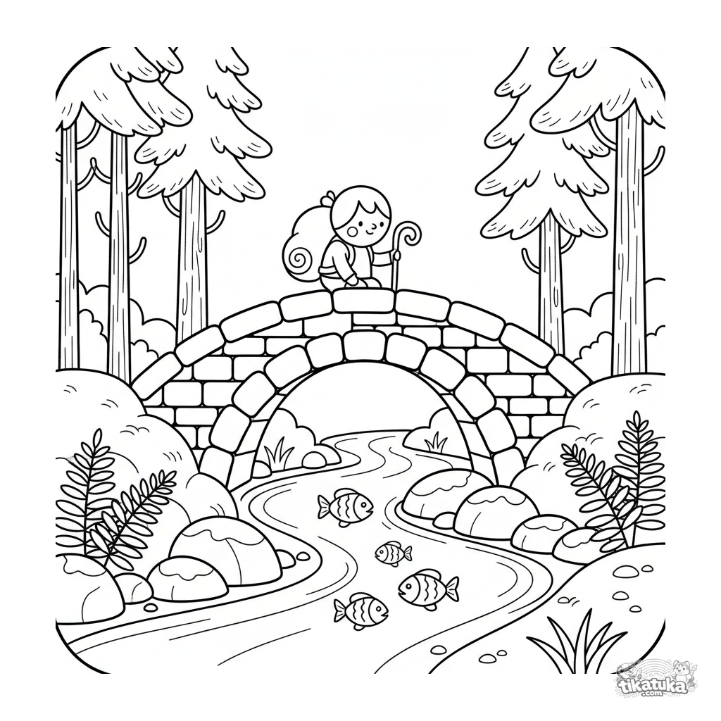 Página para colorear en estilo popular lubok de un puente en arco en el bosque para niños de 5 a 9 años. Con puente de piedra sobre arroyo, un viajero y pinos.