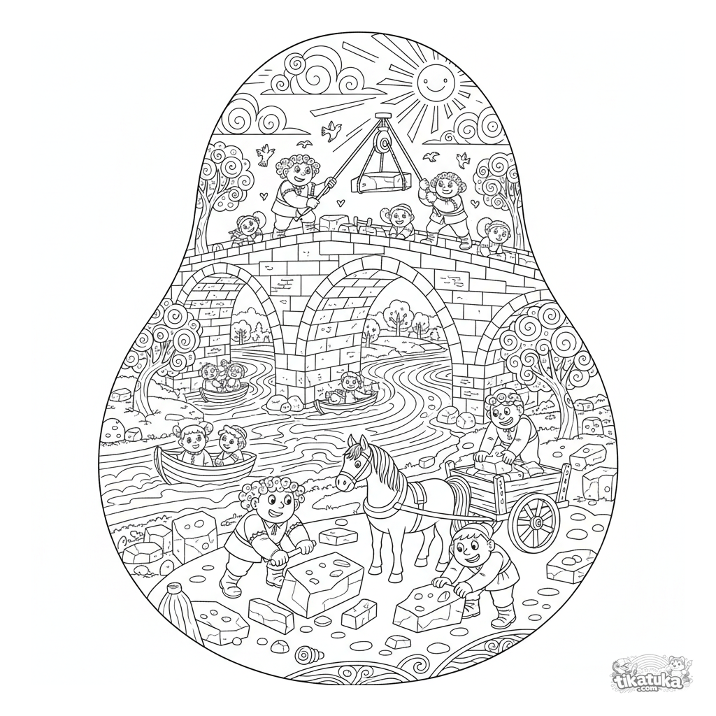 Dinámica página para colorear de arte popular de trabajadores construyendo un gran puente de piedra. Para niños mayores de 7 a 12 años. Incluye obreros, poleas, caballos y barcos en el río.
