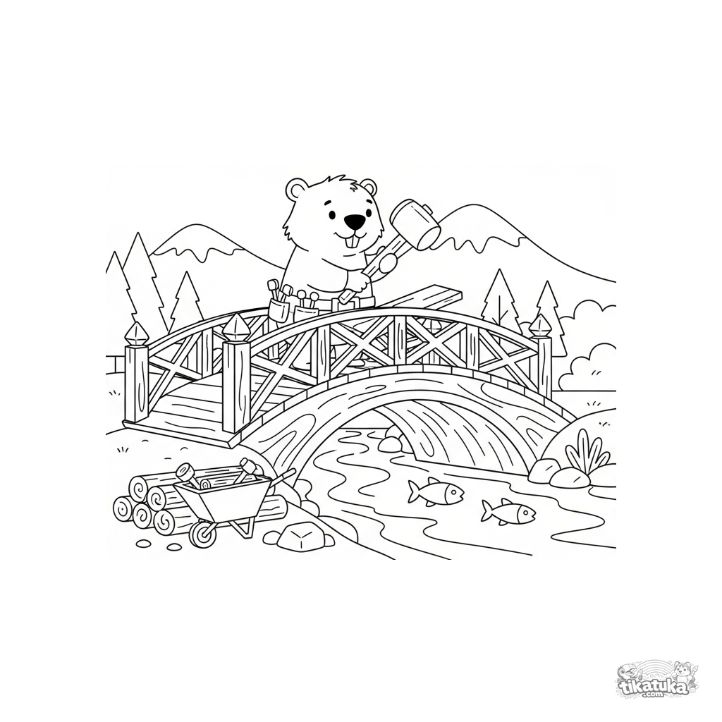 Página para colorear para niños 4-6: un puente de madera sobre un río con un castor constructor. Estilo de arte popular. Formas simples, perfectas para colorear.