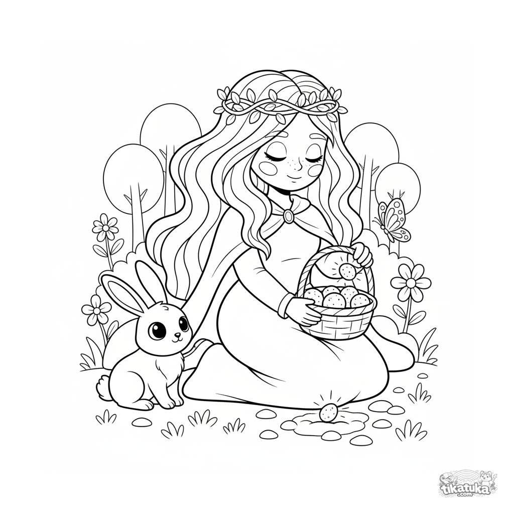 Página para colorear para niños 4-6: una princesa del bosque plantando semillas mágicas en un prado con un conejo y una mariposa.