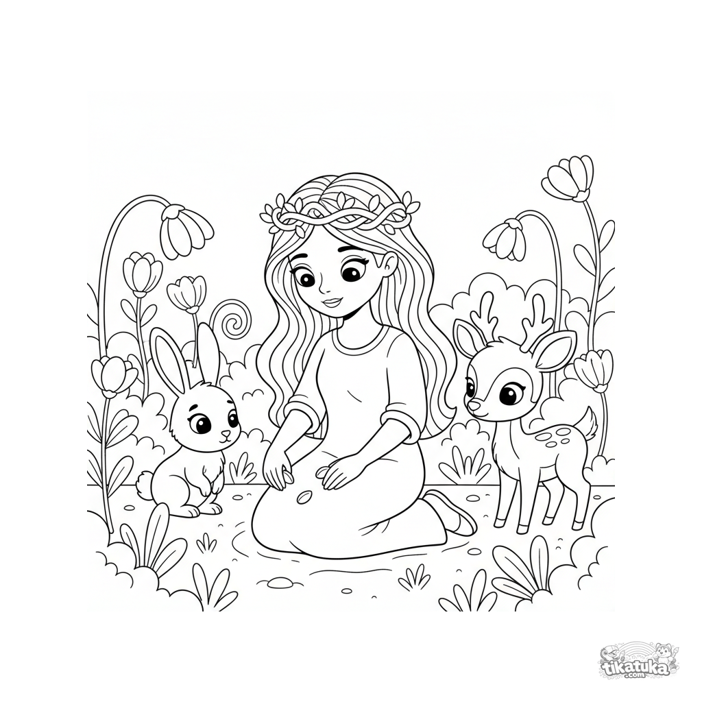 Página para colorear para niños 4-6: una princesa del bosque plantando semillas mágicas en un jardín encantado.