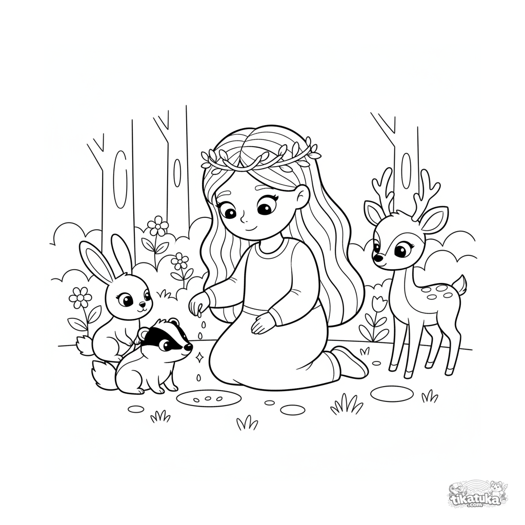 Página para colorear para niños 7-9: una princesa del bosque planta semillas mágicas con la ayuda de animales en un claro soleado.