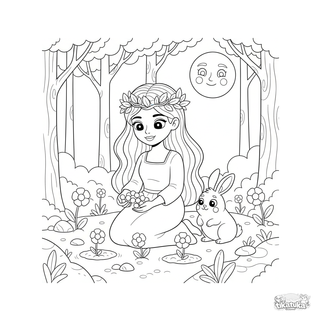 Página para colorear para niños 4-6: una princesa del bosque plantando flores mágicas a la luz de la luna con un conejo. Escena dulce en un jardín encantado.