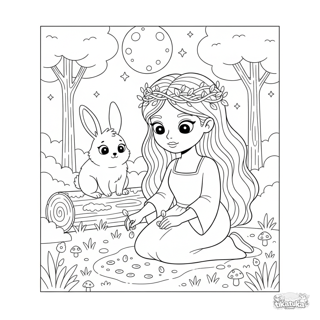 Página para colorear para niños 4-6: una princesa del bosque planta flores lunares mágicas en un jardín encantado a la luz de la luna.