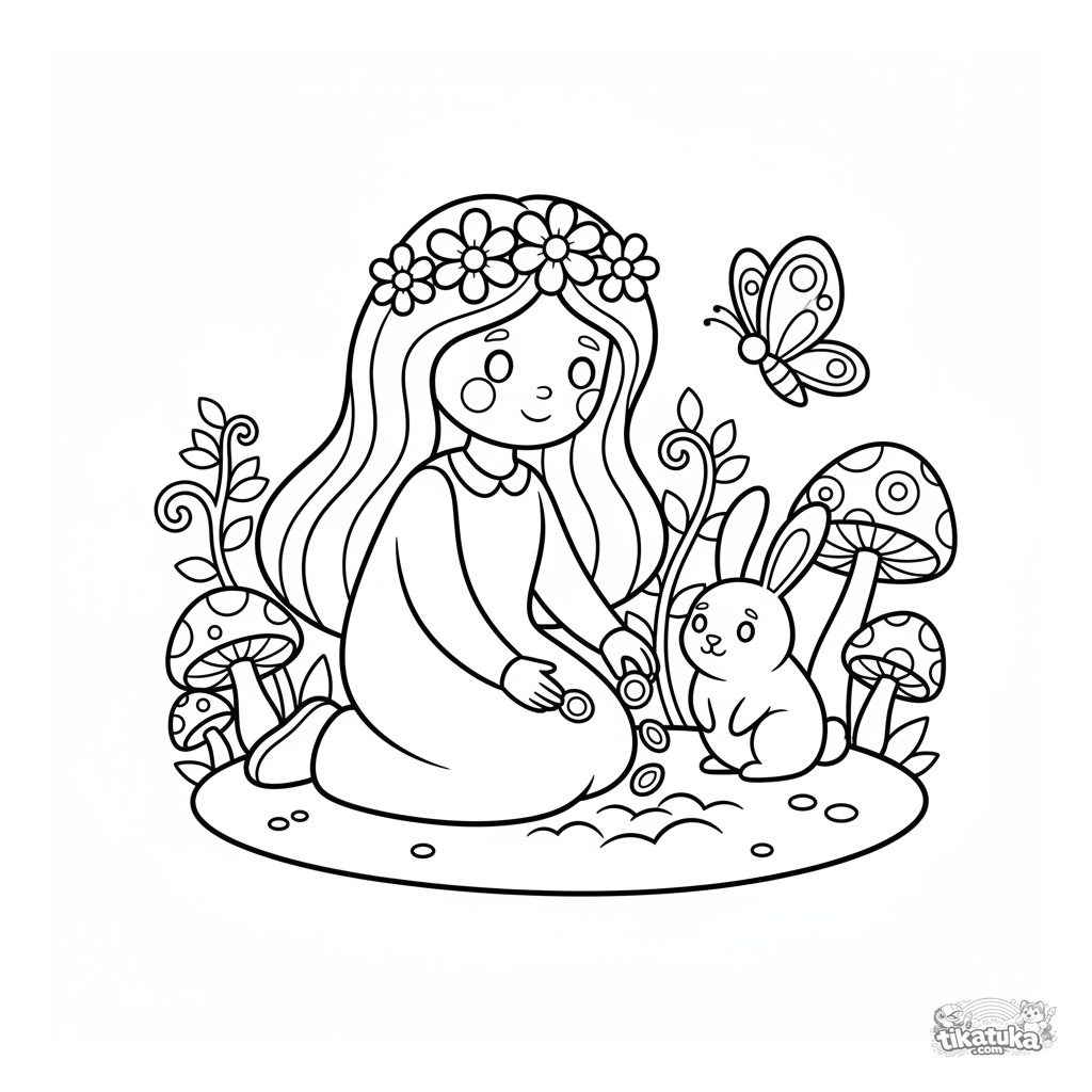 Página para colorear simple para niños de 2-3 años: una princesa del bosque con corona de flores planta semillas en un jardín encantado.