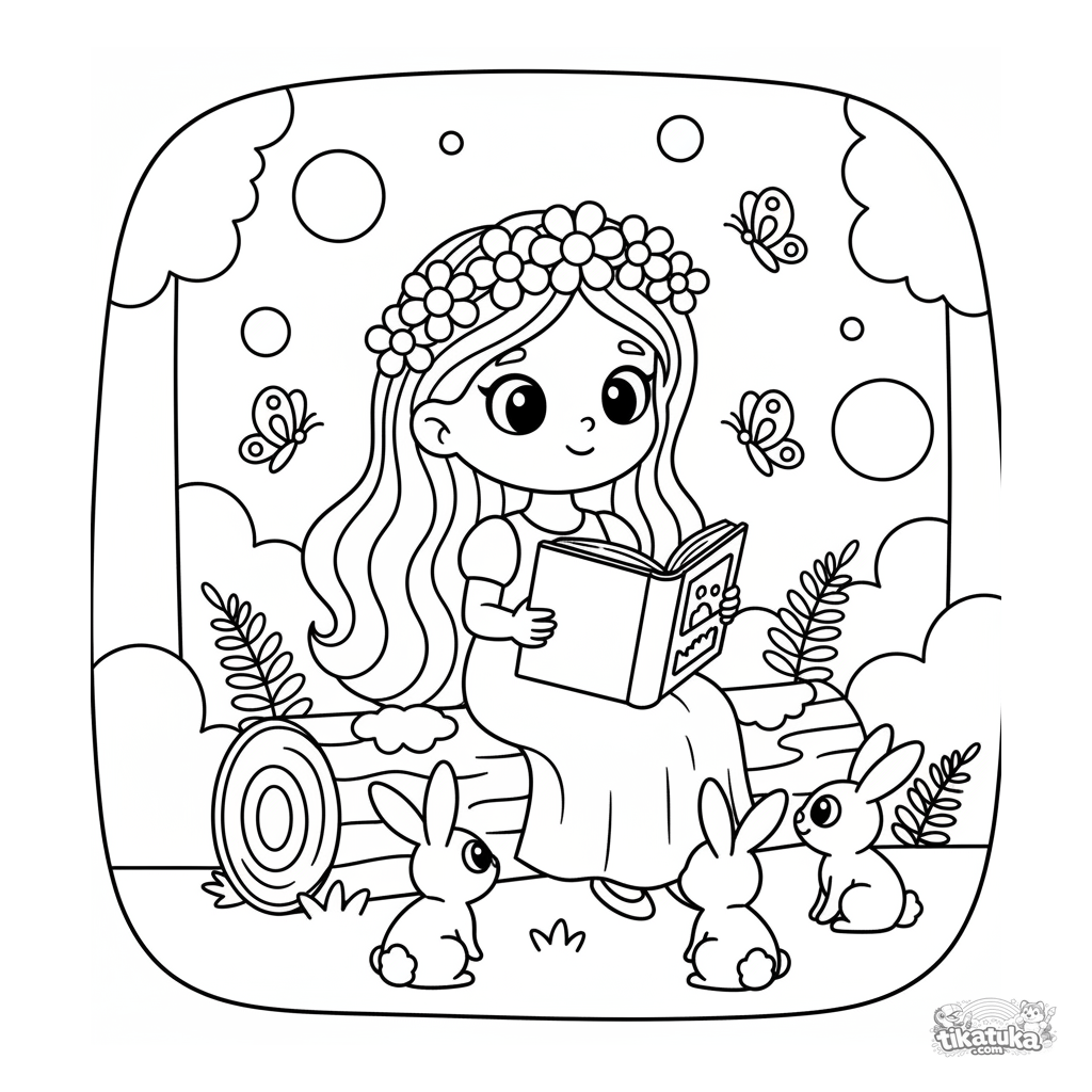Página para colorear simple para niños pequeños 2-3: una princesa del bosque con corona de flores lee un libro a conejos en un claro.