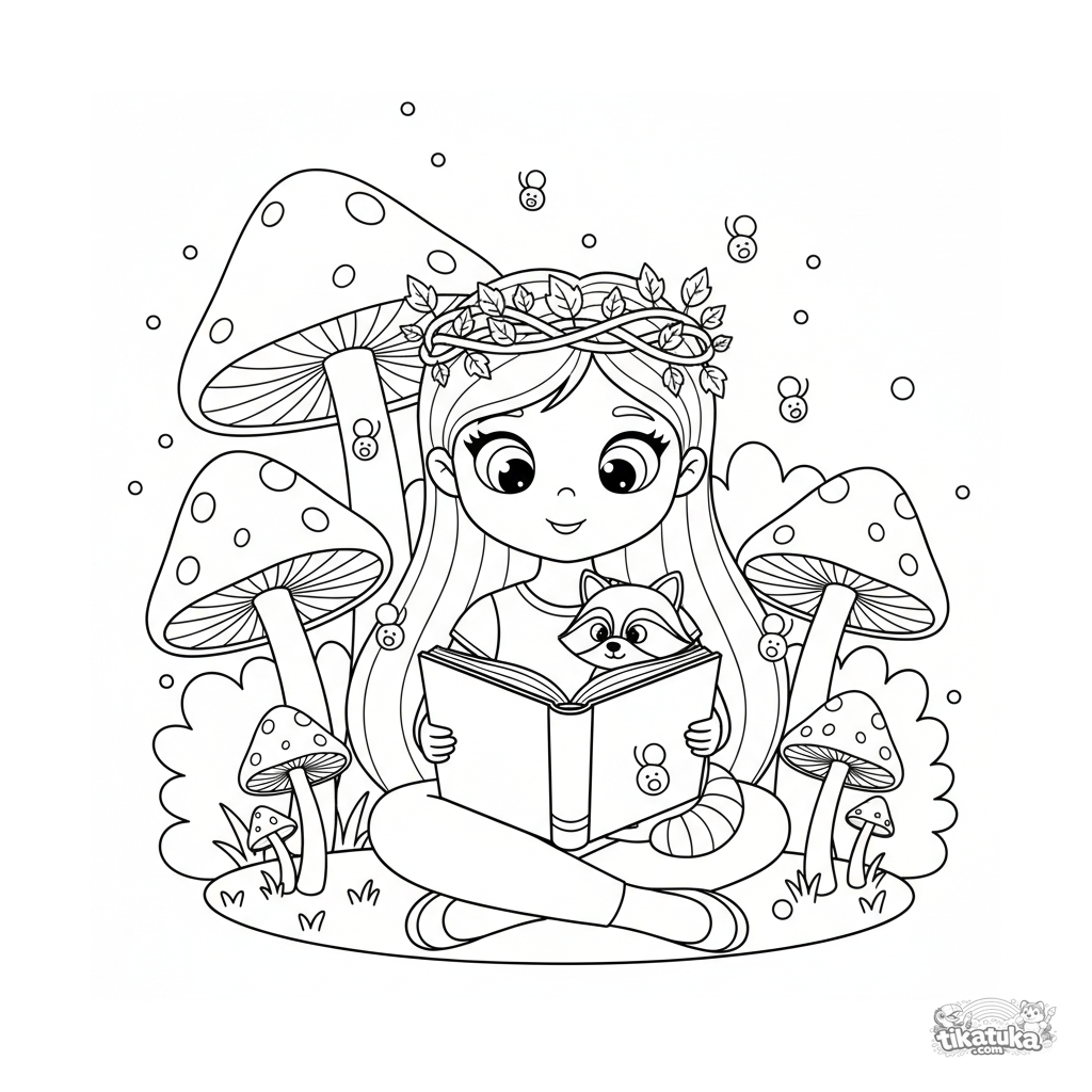 Página para colorear para niños 4-6: una princesa del bosque lee un libro a un mapache en un círculo de hongos brillantes. Hojas en su cabello, luciérnagas flotantes.