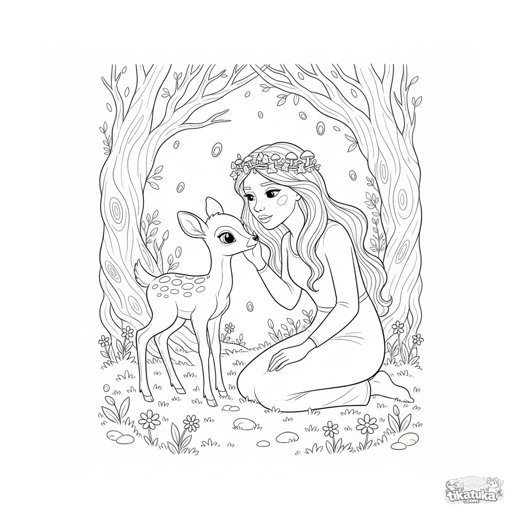 Página para colorear detallada para niños 10-12: una princesa del bosque susurrando a un cervatillo en un arroyo encantado a la luz de la luna.