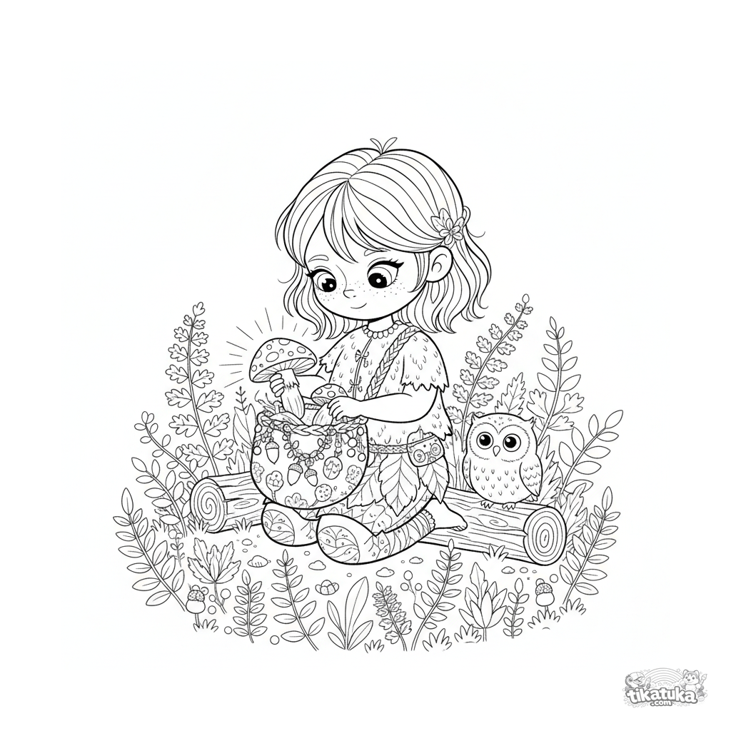 Página para colorear de fantasía para 10-12 años: un duende del bosque en un atuendo de aventura recolectando hongos en un bosque encantado, con un búho compañero cerca.