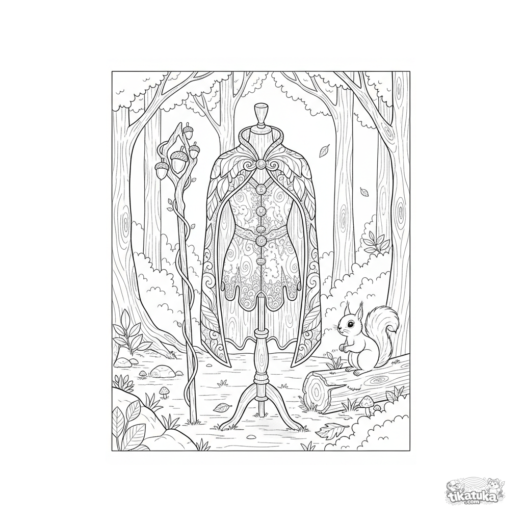 Página detallada para colorear para niñas: un disfraz de duende forestal en un maniquí de madera en un claro del bosque. Texturas de corteza y hojas, detalles naturales, ardilla cerca.