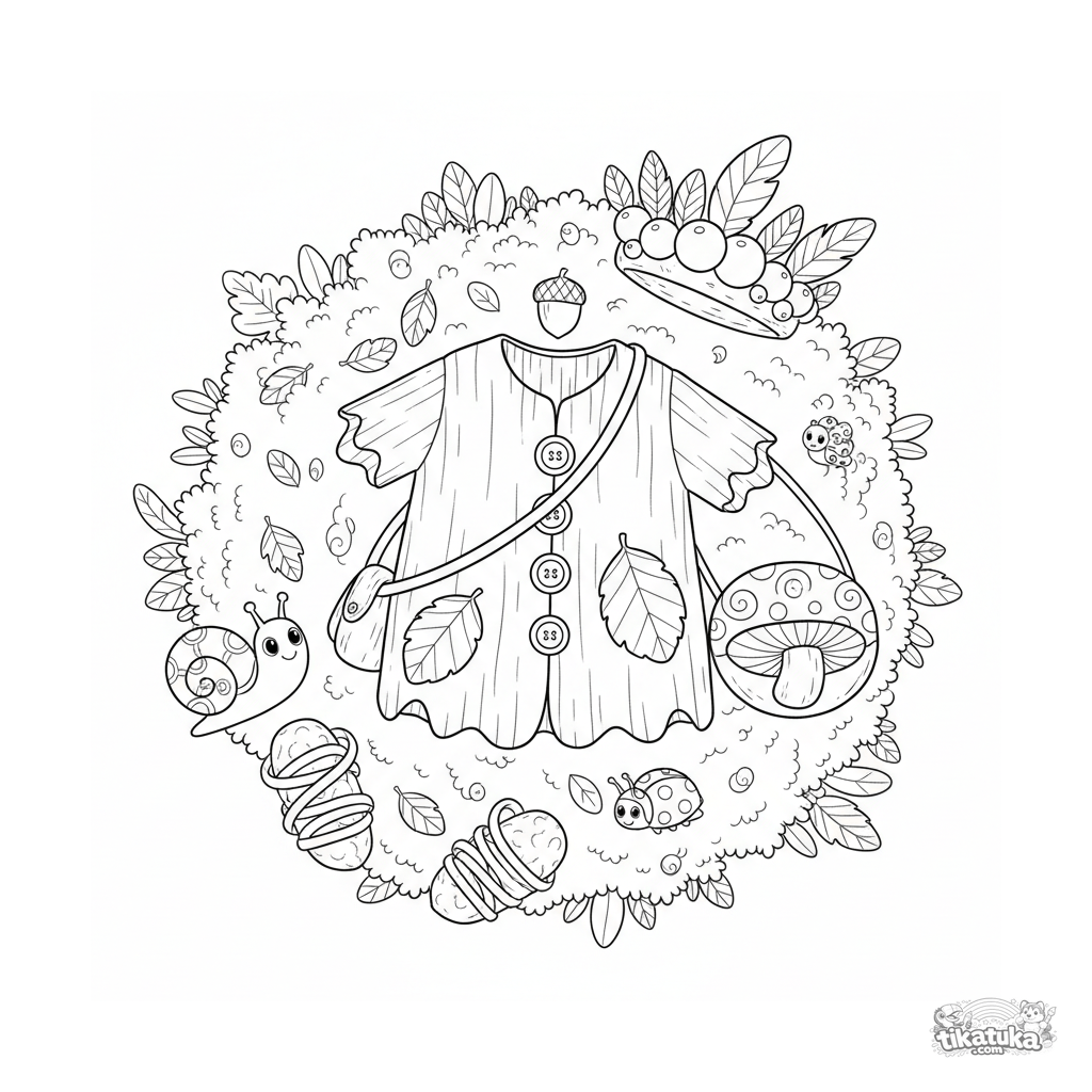 Página detallada para colorear para 10-12 años: conjunto de duende del bosque en vista plana con accesorios inspirados en la naturaleza sobre musgo y hojas.