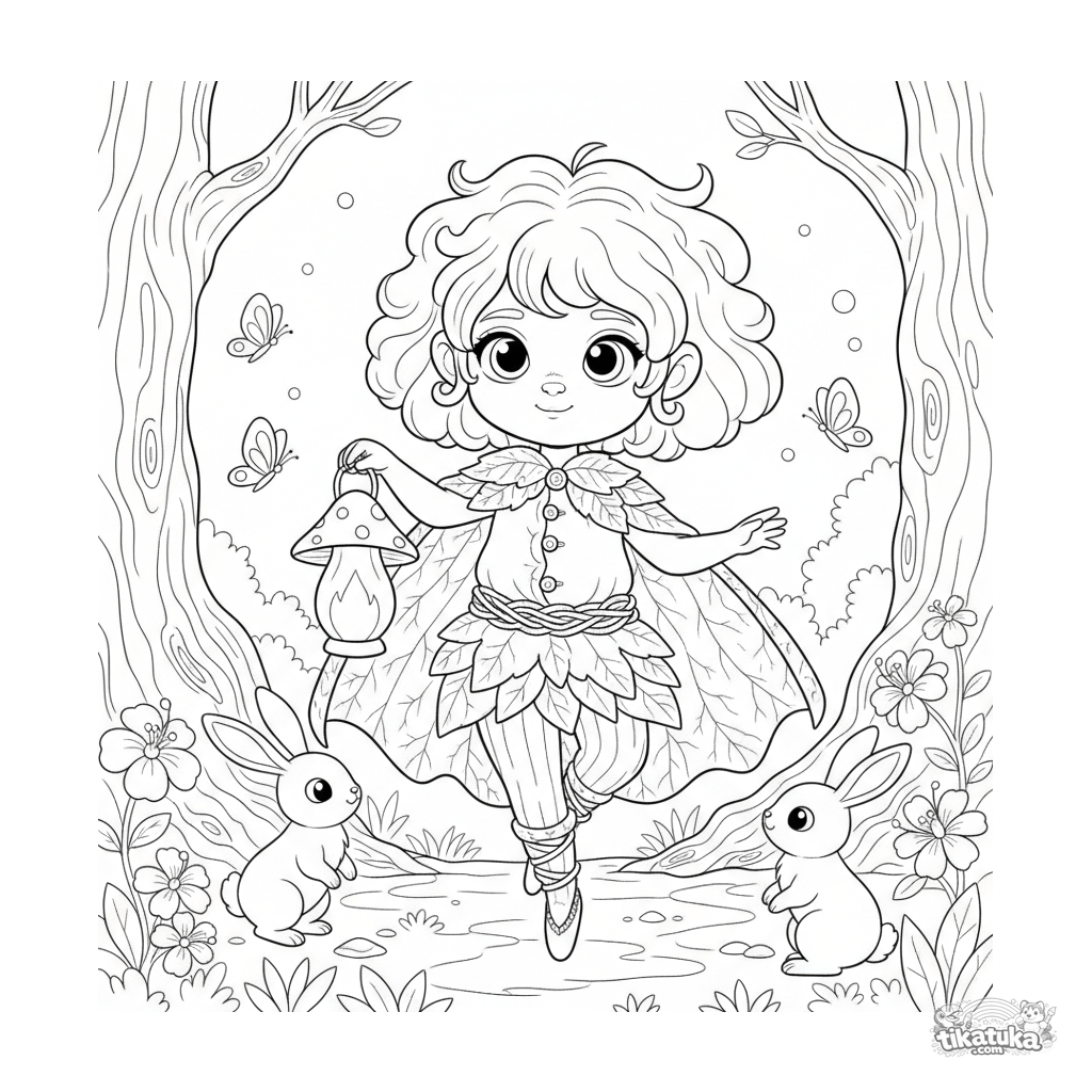 Página para colorear para niñas 10-12 años: atuendo mágico de duende del bosque en un claro encantado. Túnica detallada con hojas y bellotas, hongos brillantes y animales. Escena de fantasía rica en elementos.