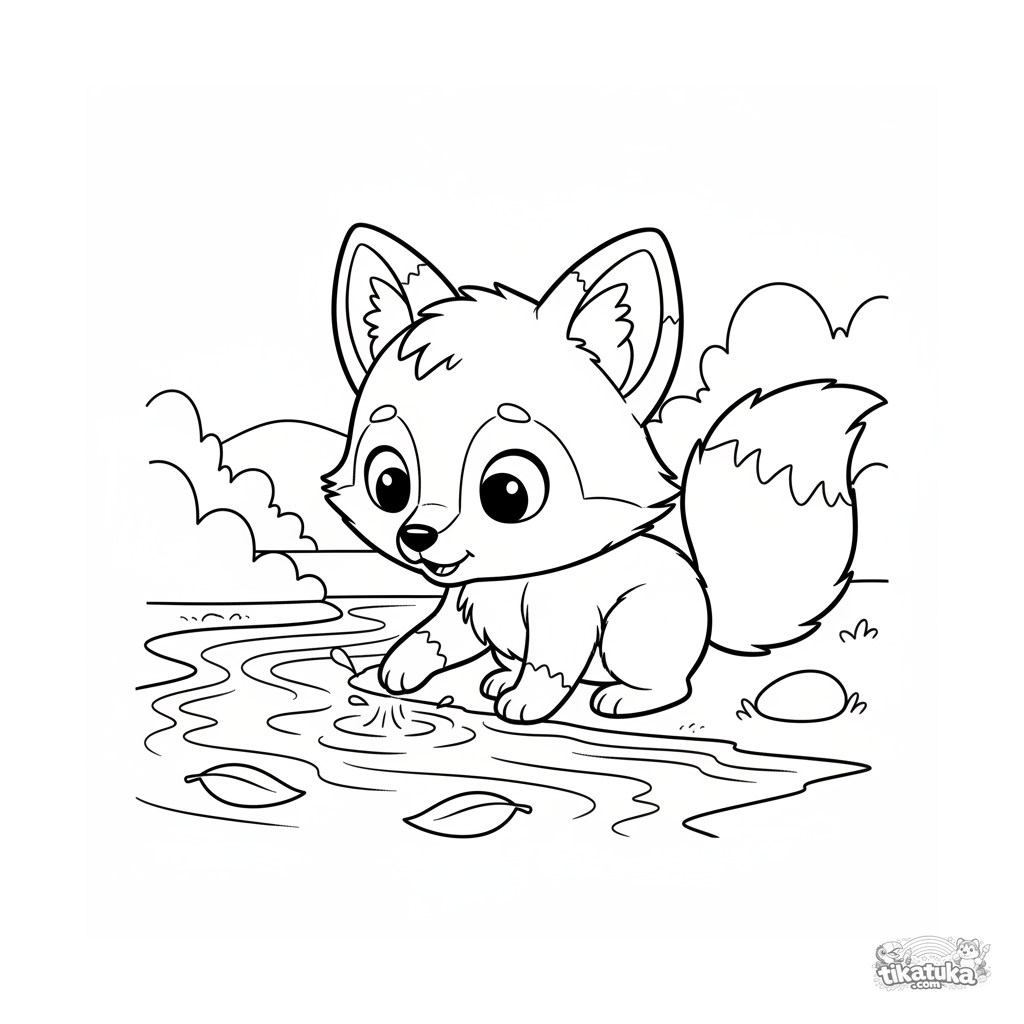 Página para colorear para niños 7-9: un cachorro de zorro curioso toca cautelosamente el agua en el borde de un arroyo claro. Escena expresiva en estilo clásico.