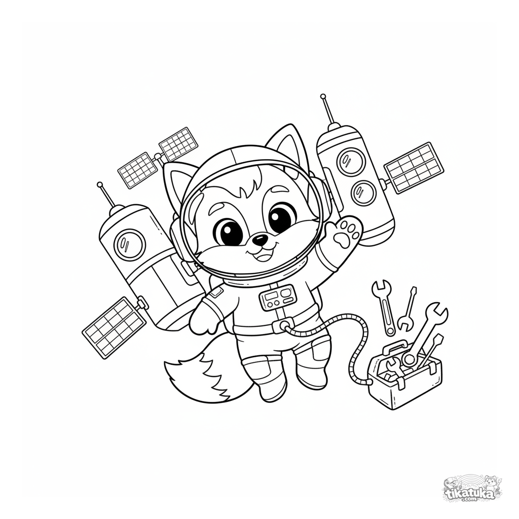 Página para colorear para niños 4-8: el zorro Foxy en traje espacial flota cerca de una estación espacial. Contornos limpios, formas simples, escena divertida.