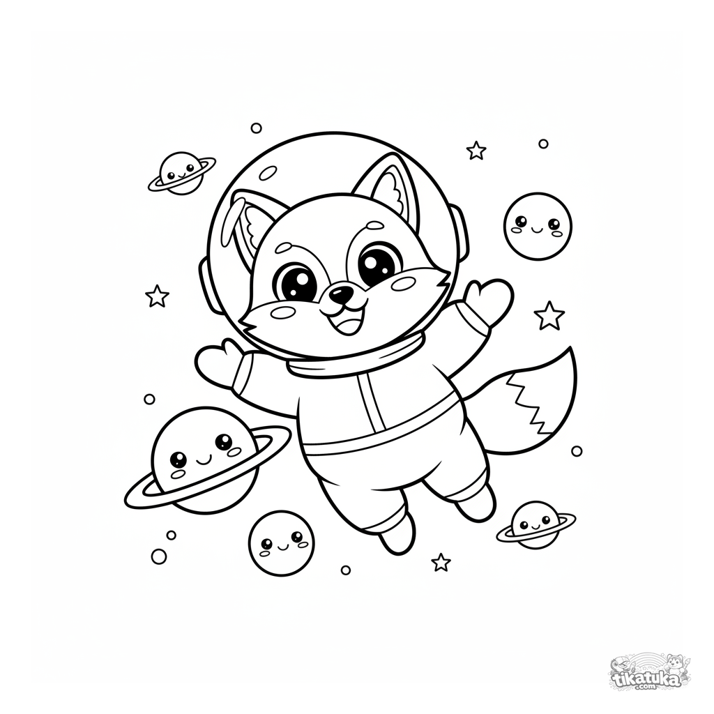 Página para colorear del espacio: el astronauta zorro Foxy flotando entre planetas sonrientes. Estilo mascota de peluche, formas simples.