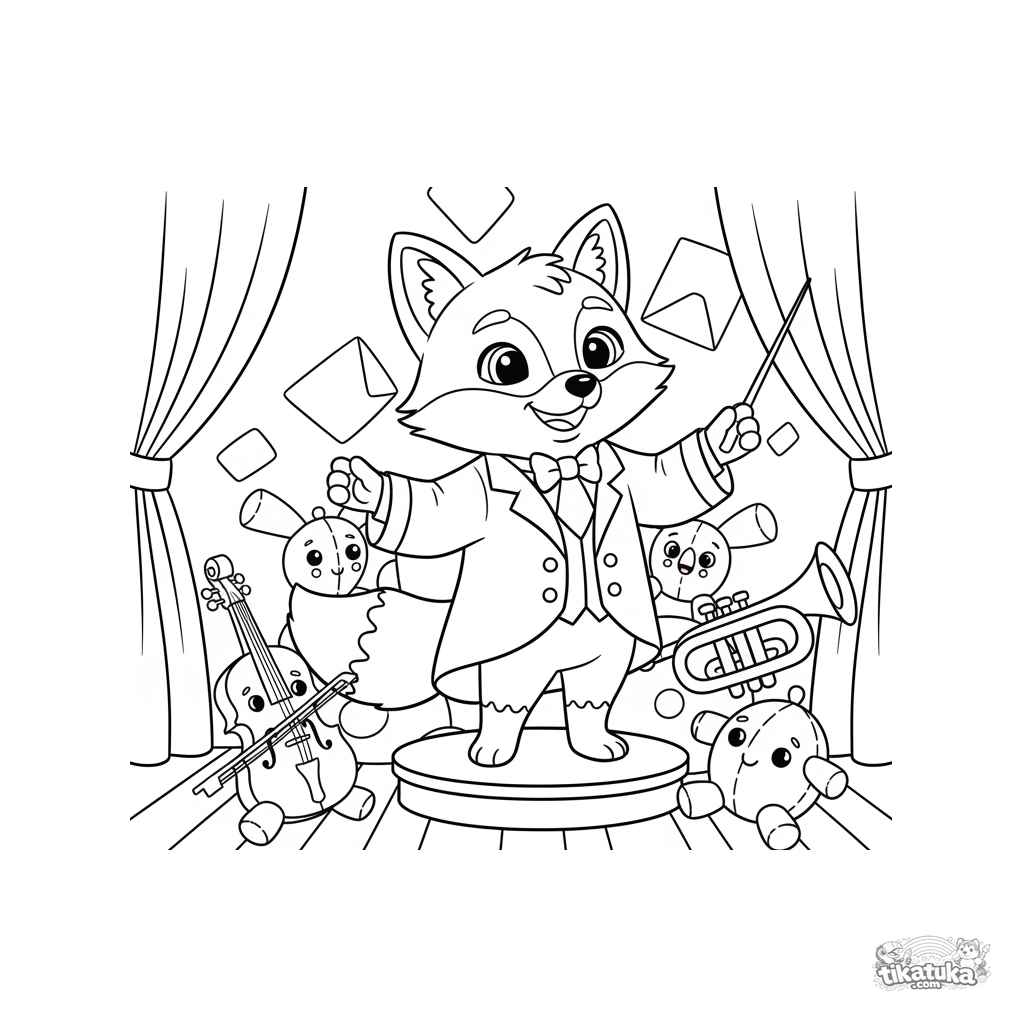 Página para colorear para niños: el zorro Foxy dirigiendo una orquesta de instrumentos de juguete en un escenario. Formas geométricas estilo juguete de madera, líneas claras, fondo simple.