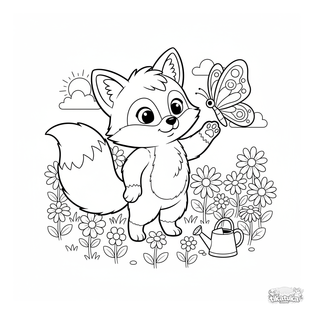 Página para colorear para niños de 4-6 años: el zorro Foxy en un jardín alcanzando una mariposa. Líneas simples, estilo juguete escandinavo.