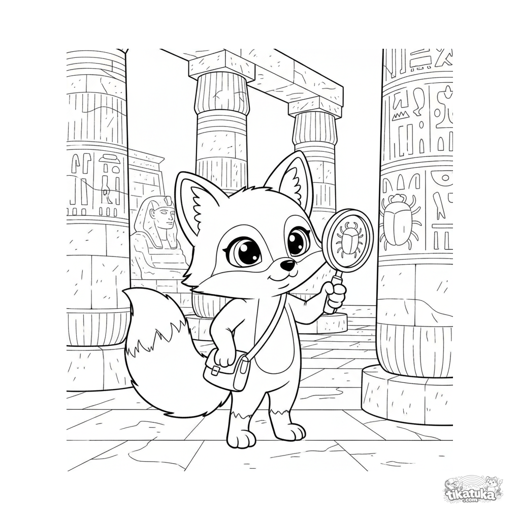 Página para colorear para niños 4-6: el zorro detective Foxy explora un templo egipcio antiguo con jeroglíficos. Formas simples estilo juguete de madera, márgenes amplios.