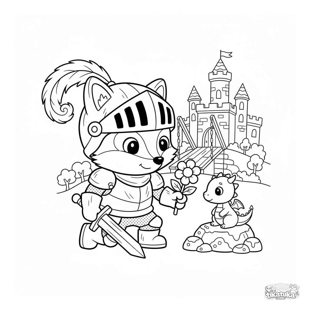 Página para colorear con el caballero zorro Foxy conociendo a un pequeño dragón cerca de un castillo. Para niños de 4 a 6 años. El caballero ofrece una flor al bebé dragón.