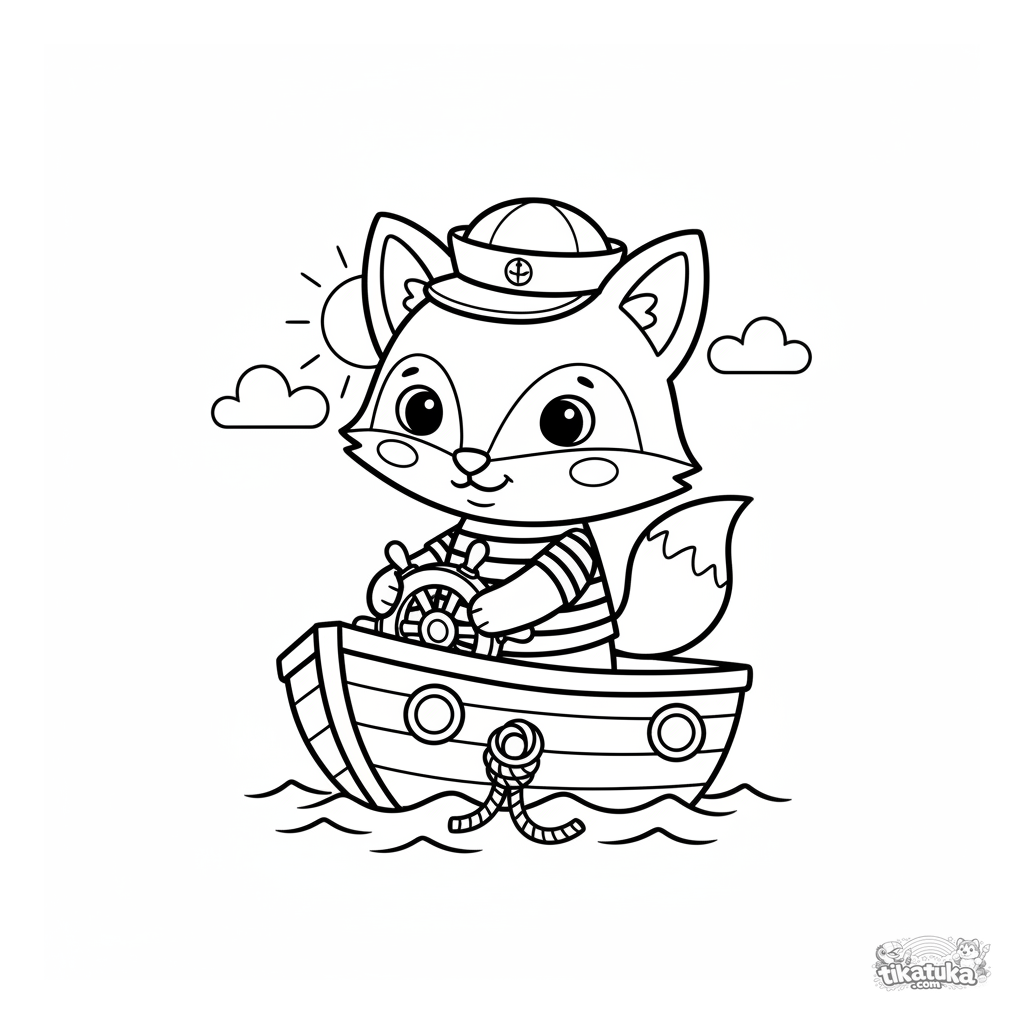 Página para colorear para niños de 4-6 años. Zorro Foxy con camiseta a rayas manejando un barco de madera. Formas geométricas como barco de juguete, líneas limpias.