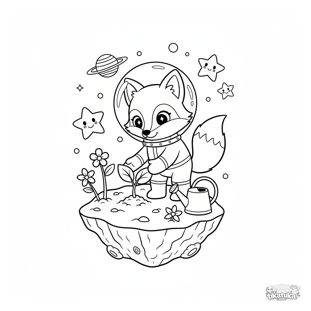 Página para colorear para niños: el zorro Foxy en traje espacial plantando flores en un asteroide en el espacio. Estilo de marioneta suave, contornos limpios, márgenes amplios.