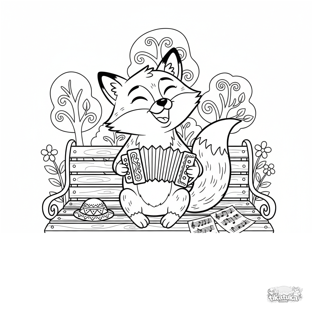 Página para colorear para niños mayores 10-12: un zorro en estilo folclórico tocando un acordeón sentado en un banco del parque. Escena musical detallada.