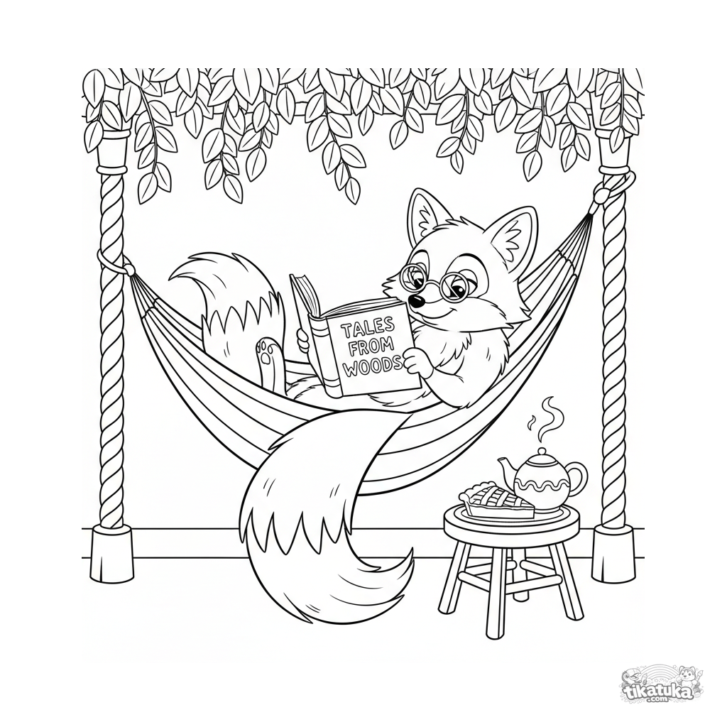 Página para colorear detallada para niños mayores de 10-12 años: un zorro se relaja en una hamaca con un libro en un porche de verano acogedor.