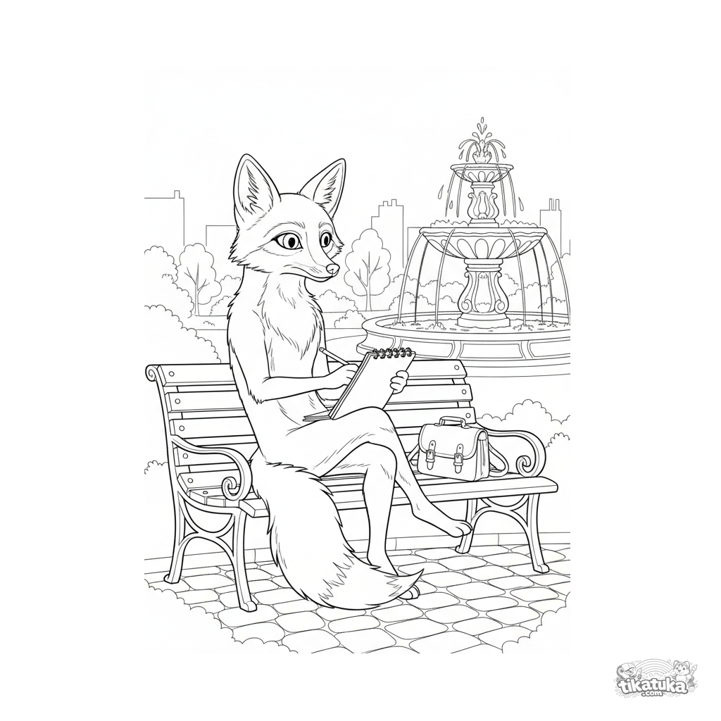 Página detallada para colorear para niños 10-12: un zorro dibujando en un banco del parque. Estilo realista y escena interesante.