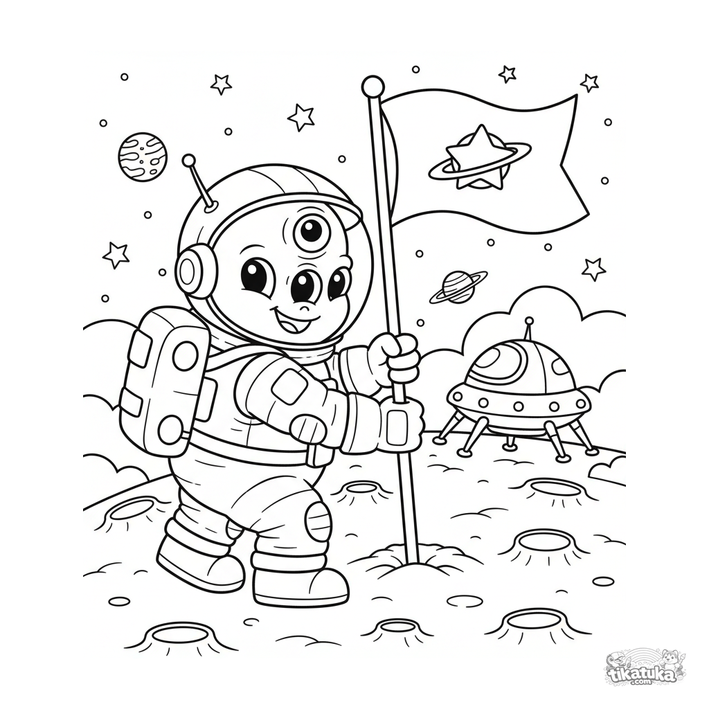 Página del espacio para colorear para niños 5-7: un alienígena amigable en traje espacial planta una bandera en la luna. Detalle moderado y formas claras.