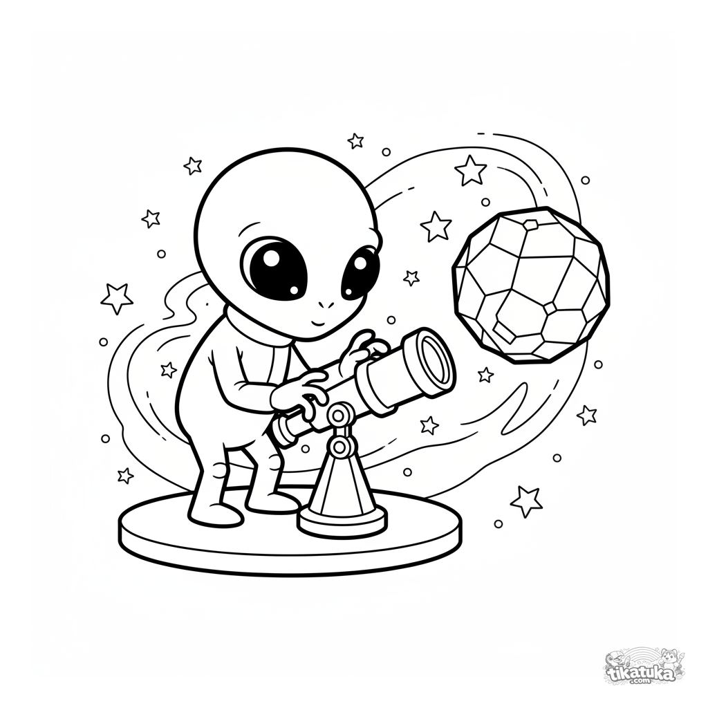 Página para colorear para niños de 4-6 años: un astrónomo alienígena amigable estudia un planeta de cristal en el espacio. Escena fantástica y simple.