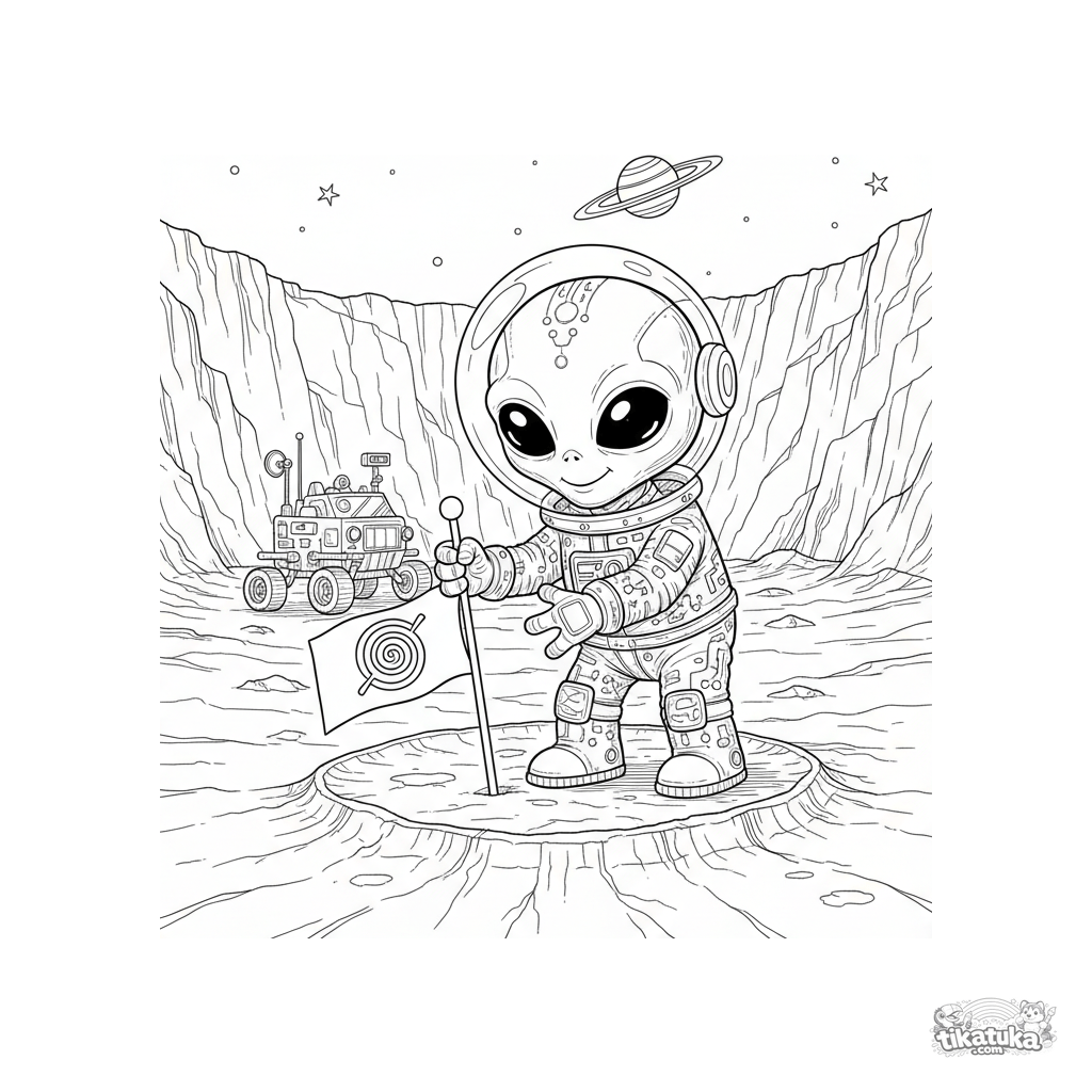 Página para colorear difícil para niños 8-12: un alienígena amigable planta una bandera en la superficie de un cráter lunar. Alto detalle, estilo realista.
