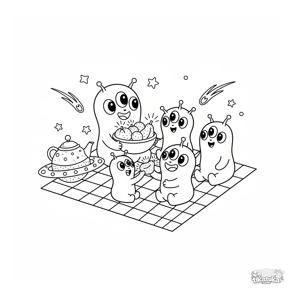 Página para colorear de tema espacial para niños de 4-6 años. Una familia de alienígenas simpáticos hace un picnic en un planeta con forma de anillo.