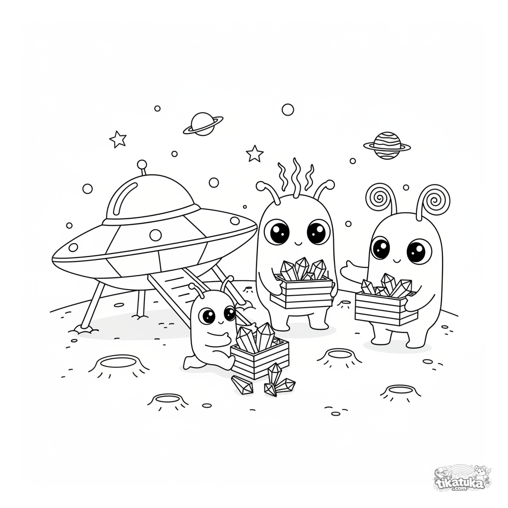 Página para colorear con tema espacial para niños de 4 a 6 años. Una familia amigable de alienígenas de ojos grandes descarga cajas de su nave con forma de platillo en la superficie lunar. Escena divertida.