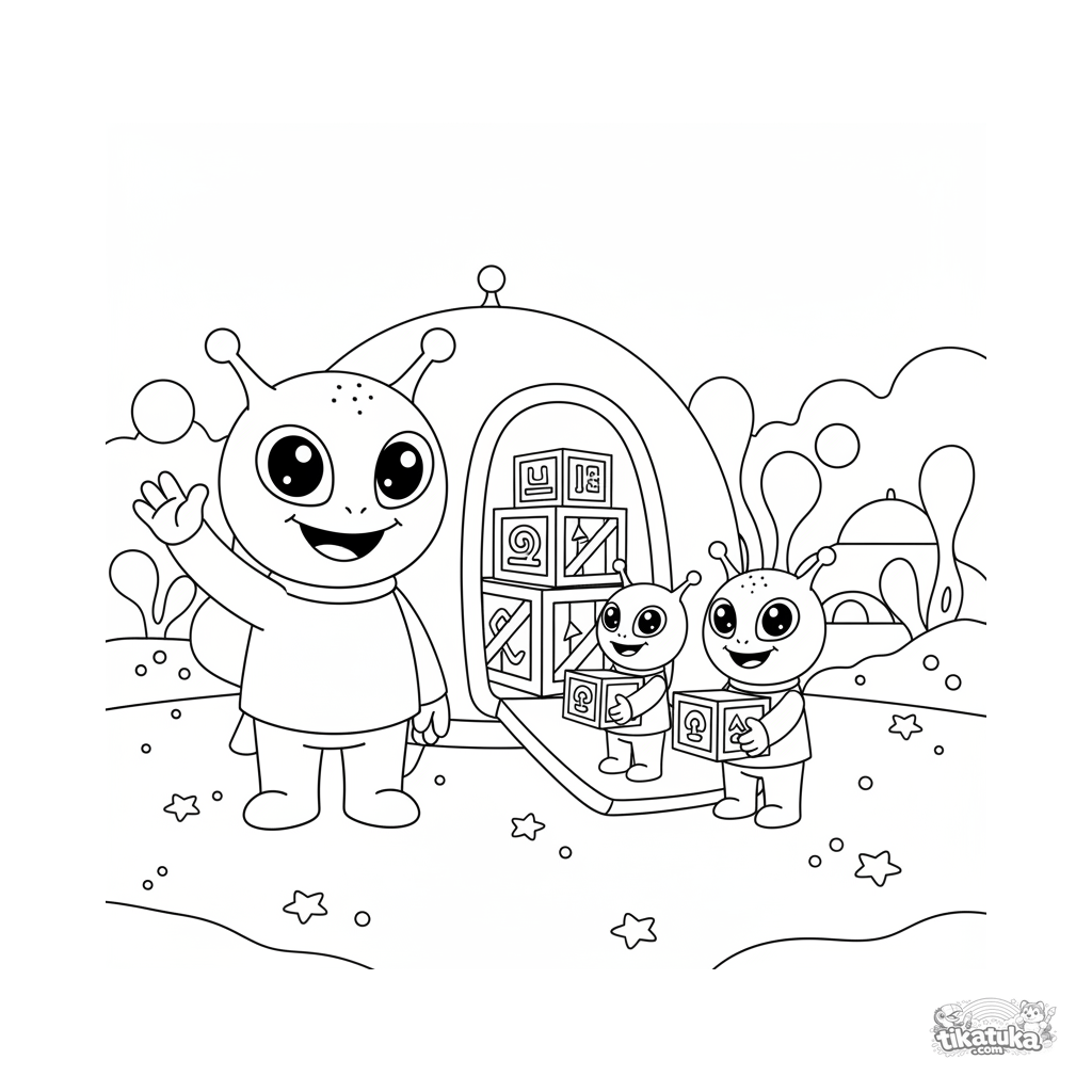 Página para colorear espacial para niños 4-6: una familia de alienígenas amigables descarga cajas junto a su nave con forma de cúpula. Fondo blanco simple, contornos claros.