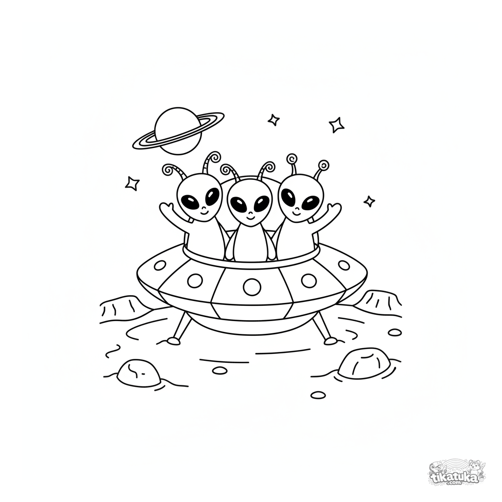 Página para colorear para niños pequeños. Una familia alienígena amigable saluda desde su OVNI en otro planeta. Contornos muy simples para 2-3 años.