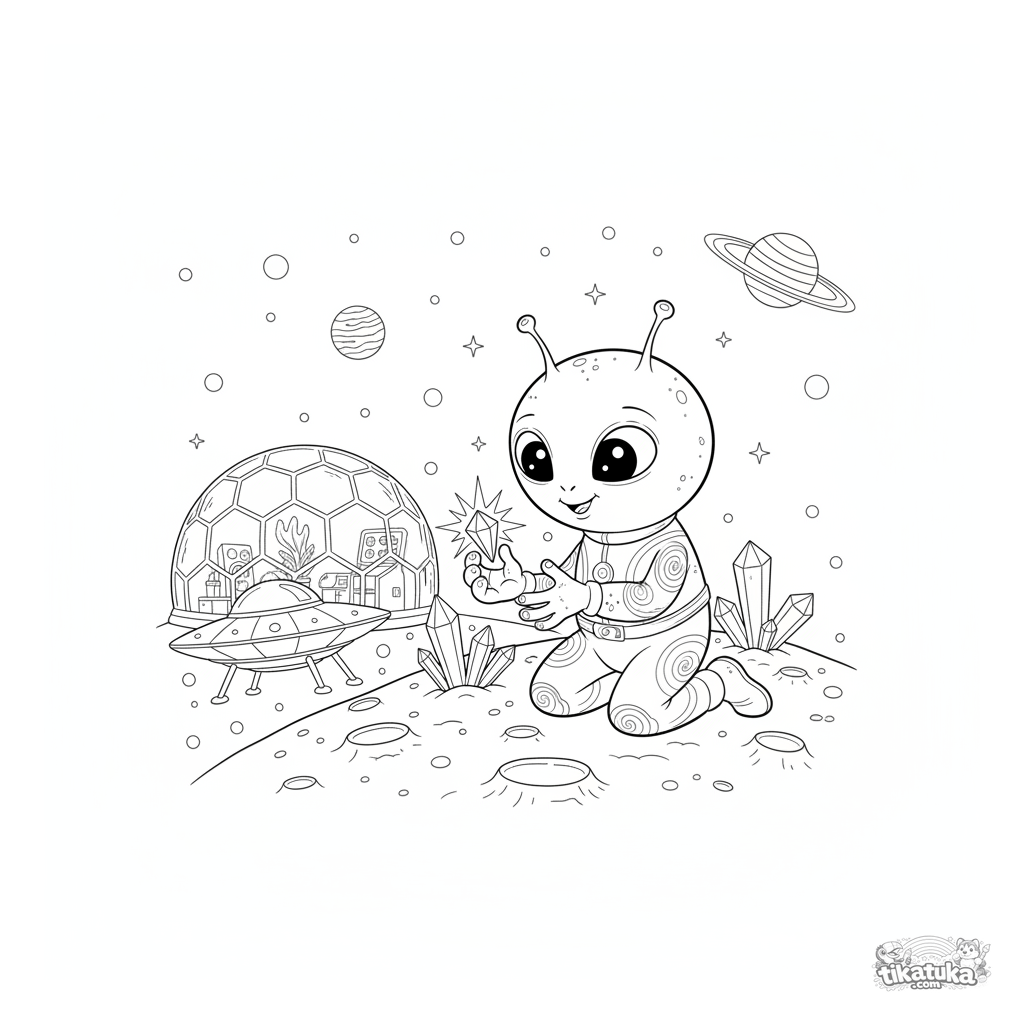 Página detallada para colorear para niños mayores: un alienígena amistoso plantando cristales brillantes en un asteroide. Para 7-12 años.