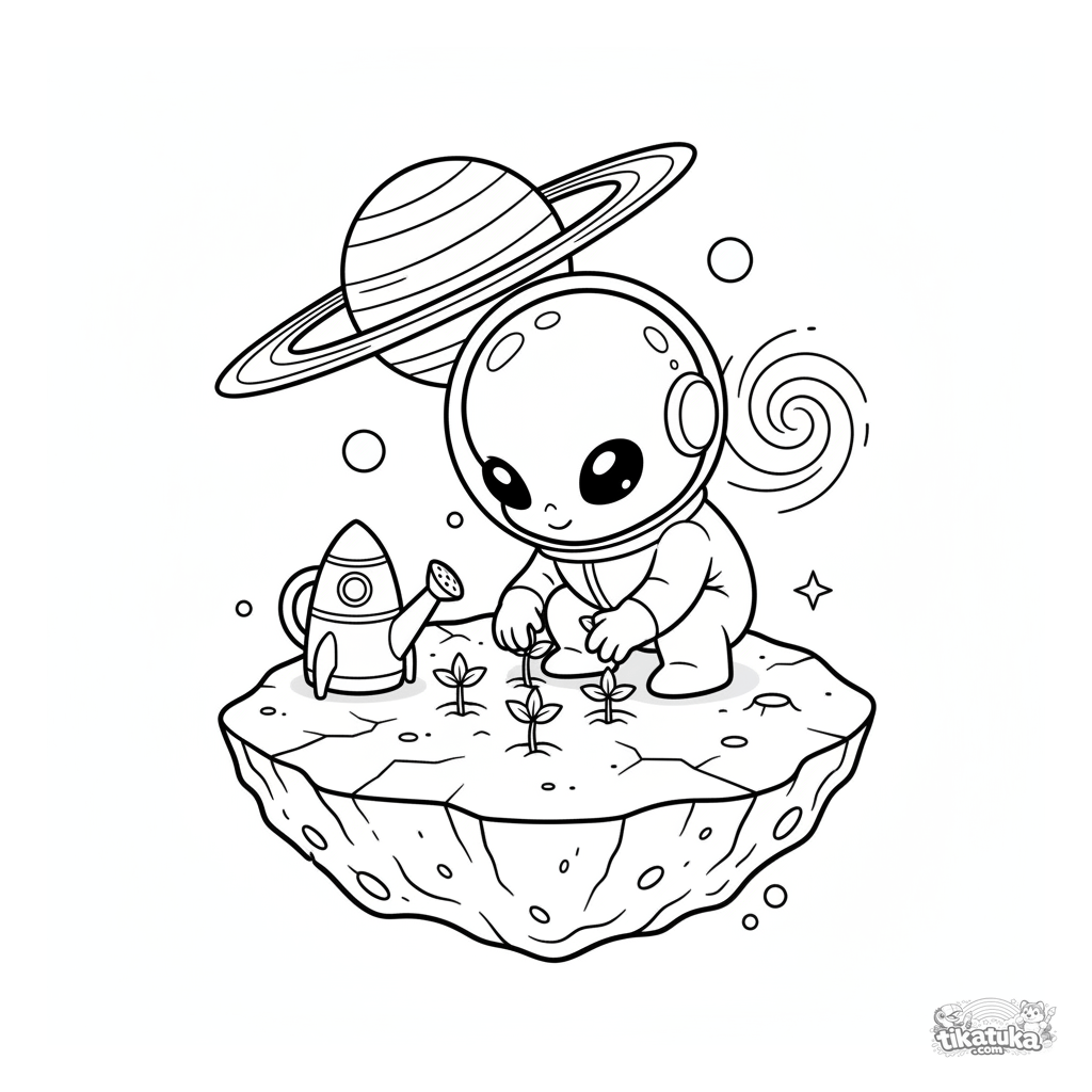 Página para colorear para niños de 4-6 años: un alienígena lindo plantando pequeñas estrellas en la superficie de un asteroide. Escena espacial divertida para estimular la imaginación.