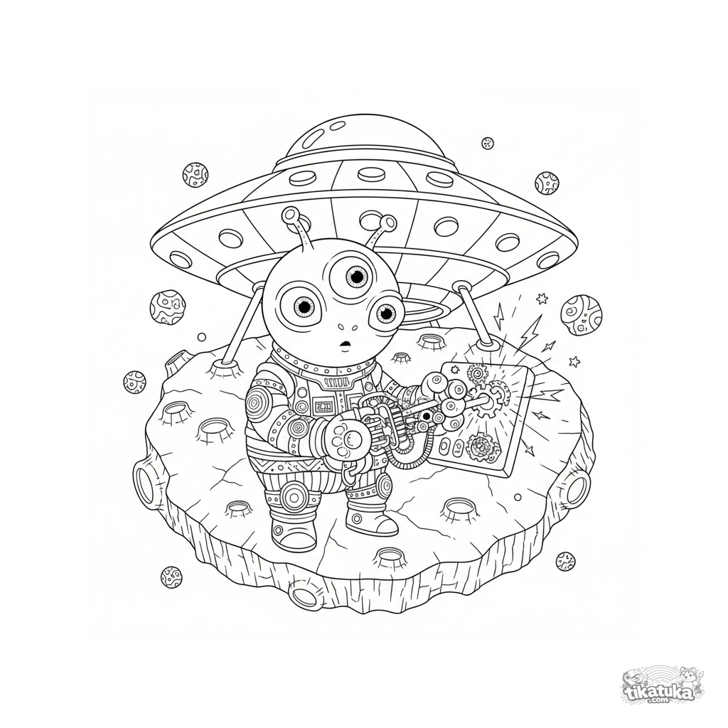 Página detallada para colorear para niños 7-12: un alienígena amigable de tres ojos reparando su nave en un asteroide. Muchos detalles, herramientas y fondo espacial.